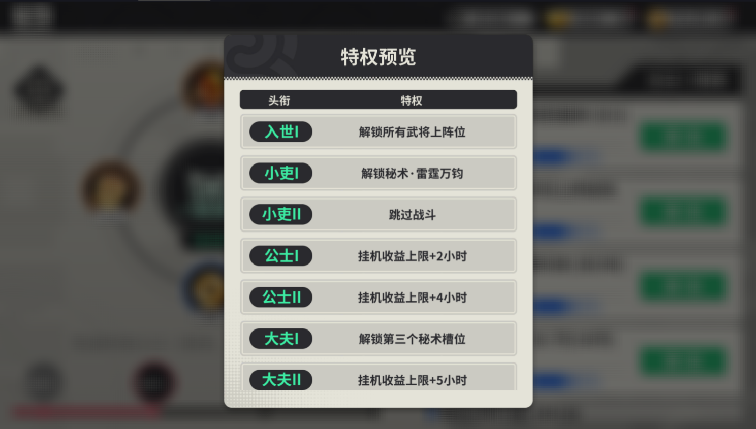 玩家可以消耗道具提升自身的爵位,可以提升自身属性,对抗爵位比自己低的玩家,还有特殊的压制属性