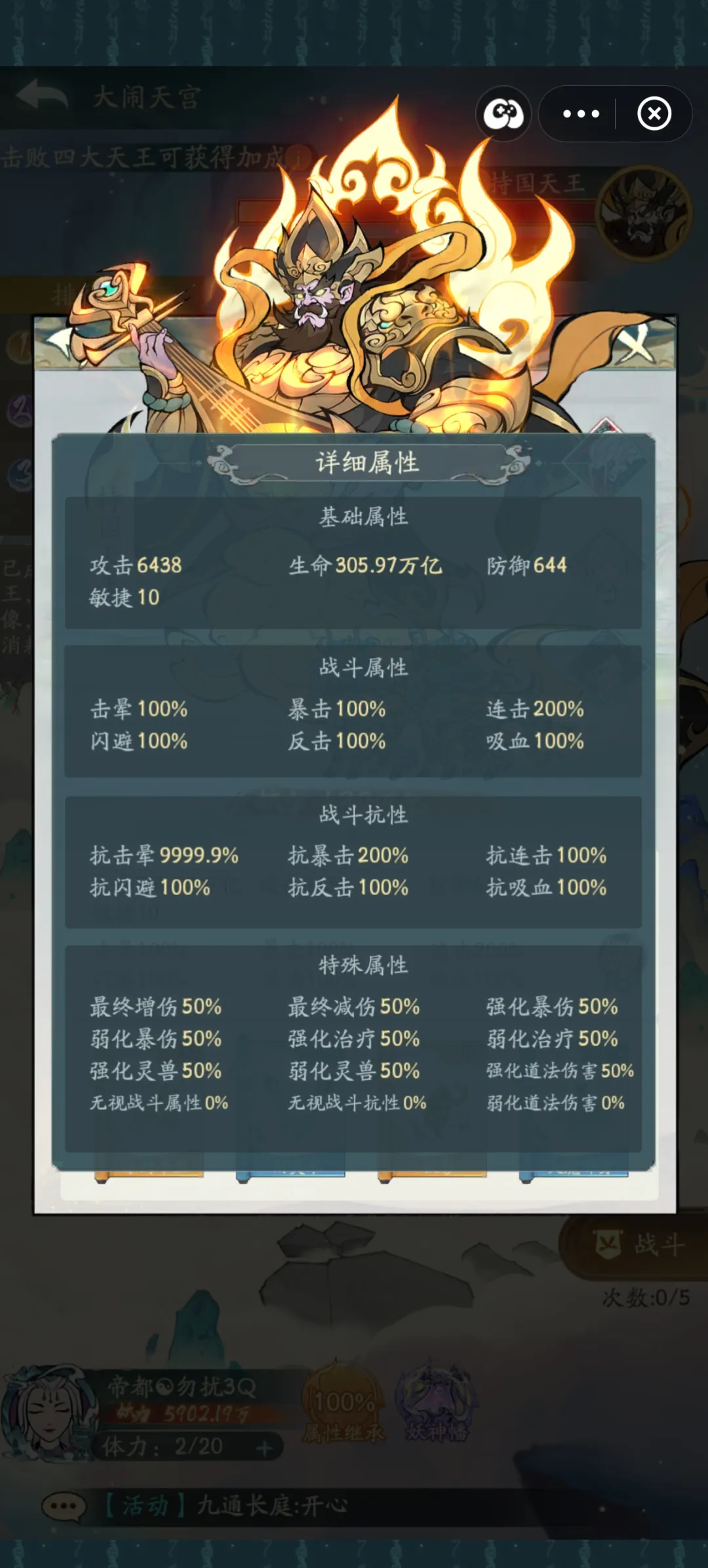 由于这个活动没有装备,也就是三围攻击力基本上都是小数值的情况,加上有的氪佬不用连暴反所以才会出现外面低200增减在活动内输出这么高的原因,假设我是双900满氪,只要我们吃满阵营输出buff,少一个四大天王也是无所谓的,但是阵营的其他人就没有那么高输出了。